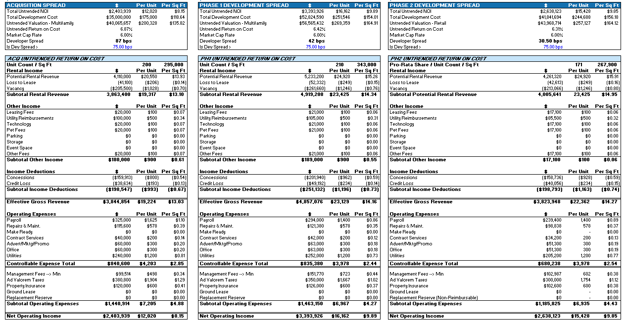 Built-in sensitivity analysis allows users to stress-test variables such as lease-up timing, cap rates, rent growth, and cost inflation to understand risk and upside potential.Scalable Across Deal Sizes