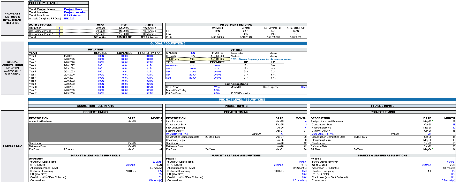 Assumptions – Centralized hub for all global assumptions, project details, and phased inputs.