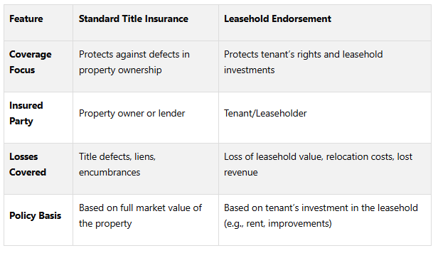 Let’s dive into the key differences between leasehold endorsements and standard title insurance. While both aim to provide financial protection in commercial real estate transactions, they cater to distinct parties and serve unique purposes.
