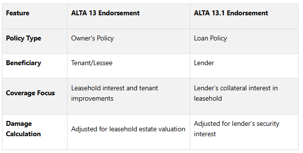 The ALTA 13 endorsement is specifically crafted to protect leasehold owners, including coverage for any tenant improvements. On the flip side, the ALTA 13.1 endorsement is designed for lenders, providing protection for the leasehold estate tied to leasehold loan policies.