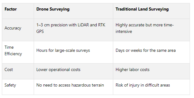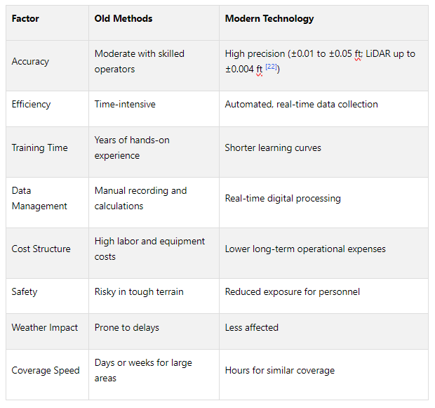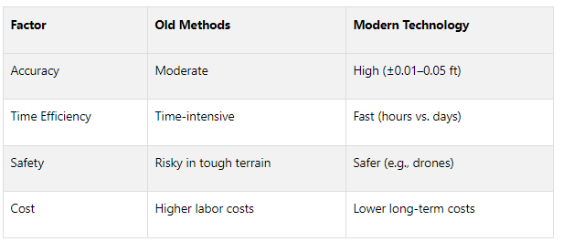 Old vs. New Methods: Modern tools are faster, safer, and more accurate compared to traditional surveying techniques.