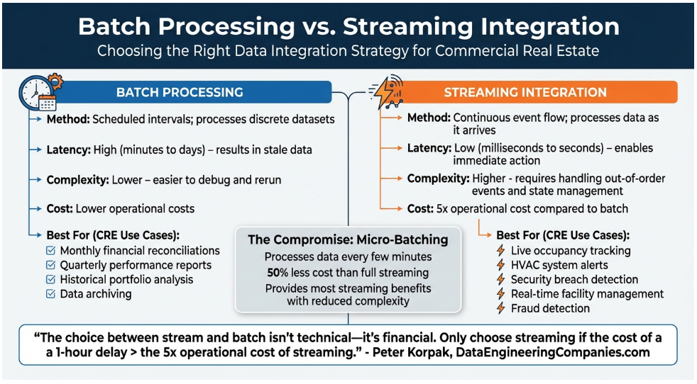 After tackling data quality and latency issues, CRE firms face another critical decision: selecting the right integration strategy. Choosing between batch processing and streaming integration is essential for aligning technology with business needs and priorities.