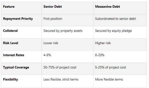 Senior Debt: Lower risk, lower interest rates (typically 4-8%), secured by property assets, and takes first priority in repayment. Covers 50-75% of project costs.
