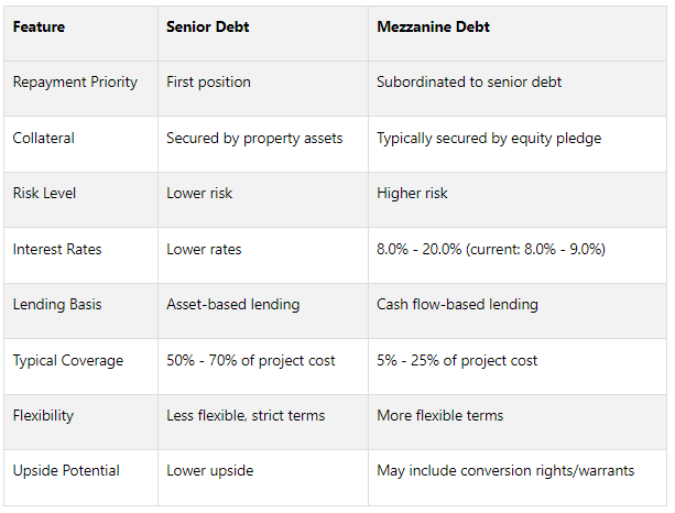 Mezzanine Debt: Higher risk, higher interest rates (8-20%), secured by equity in the property-owning entity, and ranks below senior debt in repayment. Fills 5-25% of funding gaps.