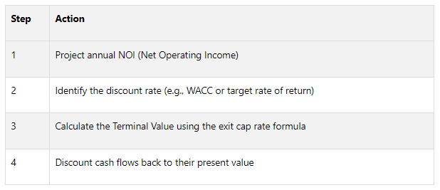Incorporating the terminal cap rate into a DCF model involves a structured process. The terminal cap rate is used to estimate the property's resale value at the end of the holding period.