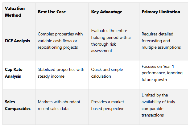These differences highlight why DCF is often the go-to method for long-term, complex evaluations. For properties with intricate lease structures, planned renovations, or repositioning needs, DCF's detailed forecasting becomes essential. Meanwhile, cap rate analysis is useful for quickly screening stabilized assets, and sales comparables help validate assumptions against market trends.