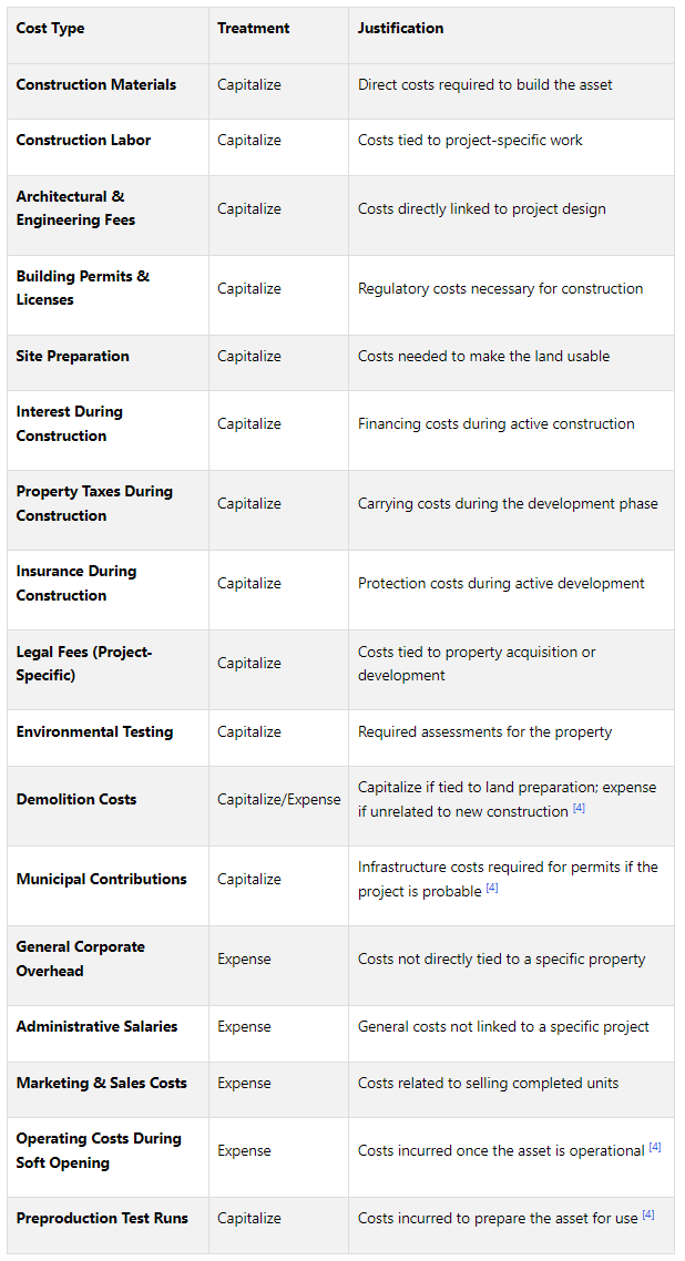 Development Costs: Costs directly tied to construction (e.g., materials, labor, permits) are capitalized.
