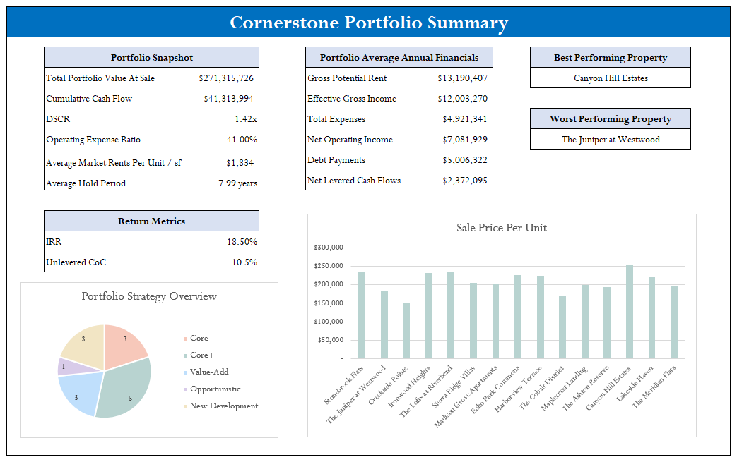Underwrite commercial deals with speed and precision using the Commercial Acquisition Model, IRR Matrix, Rate-Cap NPV tool, and Portfolio Rollup.